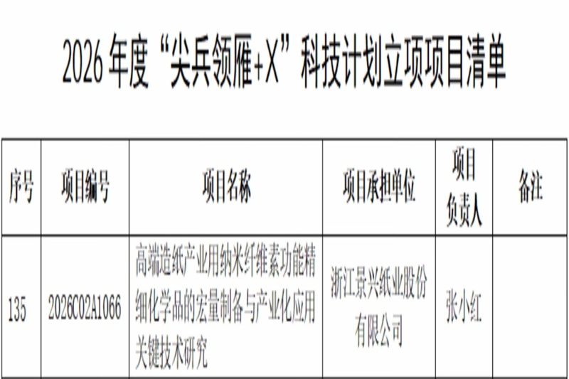 喜報(bào)!景興紙業(yè)研發(fā)項(xiàng)目入選2026年度浙江省“尖兵領(lǐng)雁+X”科技計(jì)劃